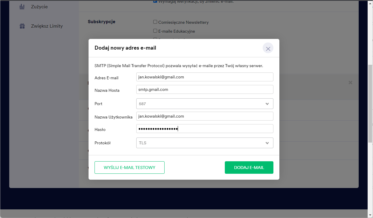 - Kliknij przycisk Wyślij E-mail Testowy, by upewnić się, że wszystko działa.