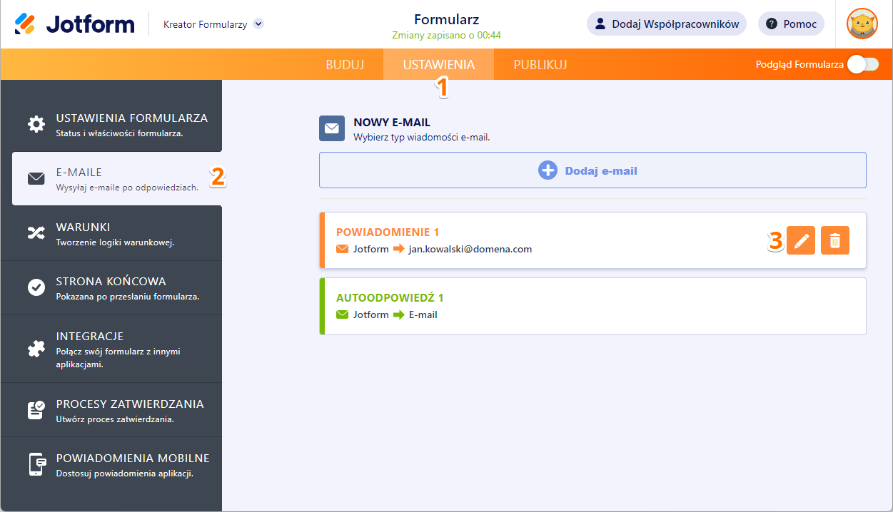 - Przejdź do zakładki E-maile, by skonfigurować ustawienia wiadomości e-mail.