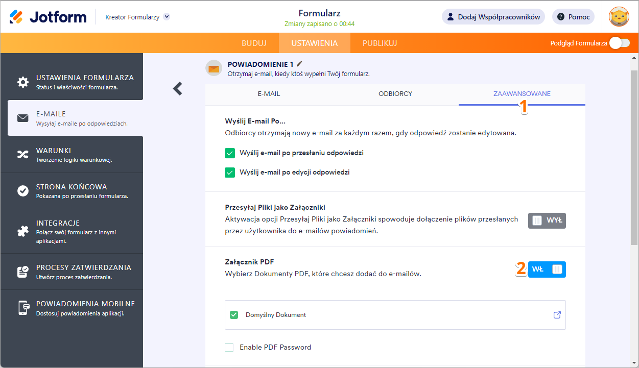 Jotform pozwala Ci dołączać pliki PDF z odpowiedziami do Powiadomień E-mail, umożliwiając śledzenie danych bezpośrednio z poziomu skrzynki odbiorczej.