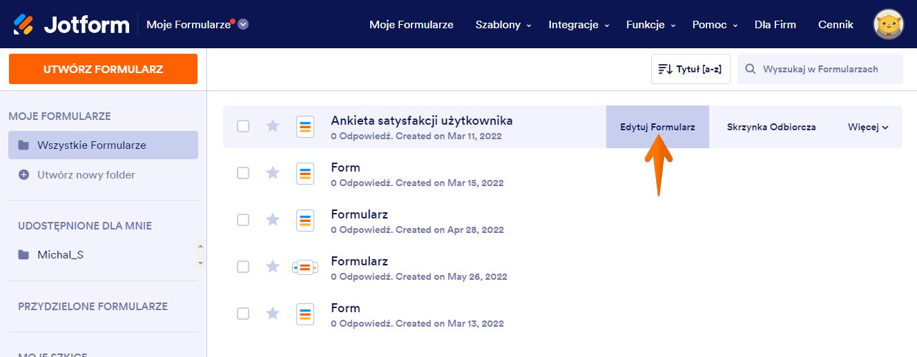 Przejdź na stronę Moje Formularze, wybierz formularz, którego układ chcesz zmienić i kliknij Edytuj Formularz.
