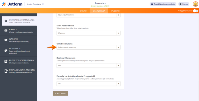 - Znajdź opcję Układ Formularza i zmień ją na Jedno pytanie na stronę.