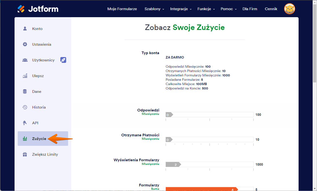 Po zalogowaniu na konto Jotform, możesz wyświetlić aktualne zużycie najeżdżając myszą na swój Avatar w prawym górnym rogu strony. Możesz także przejść do zakładki Zużycie Ustawień Konta.