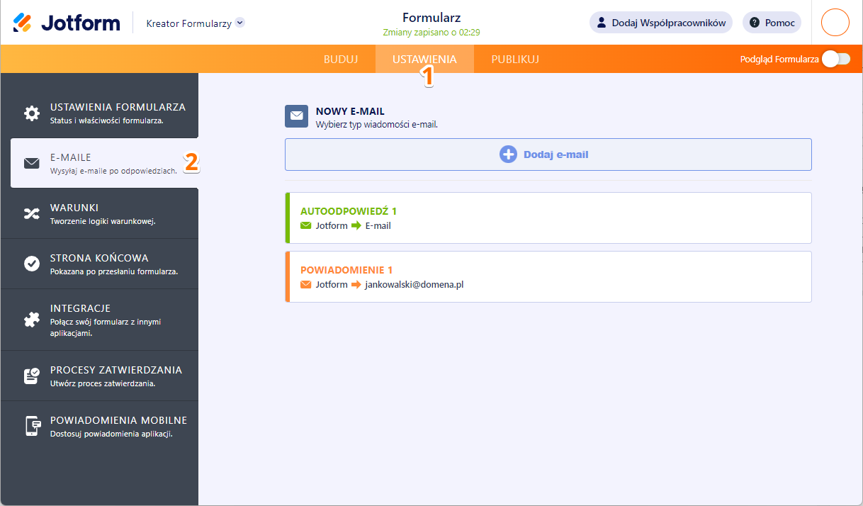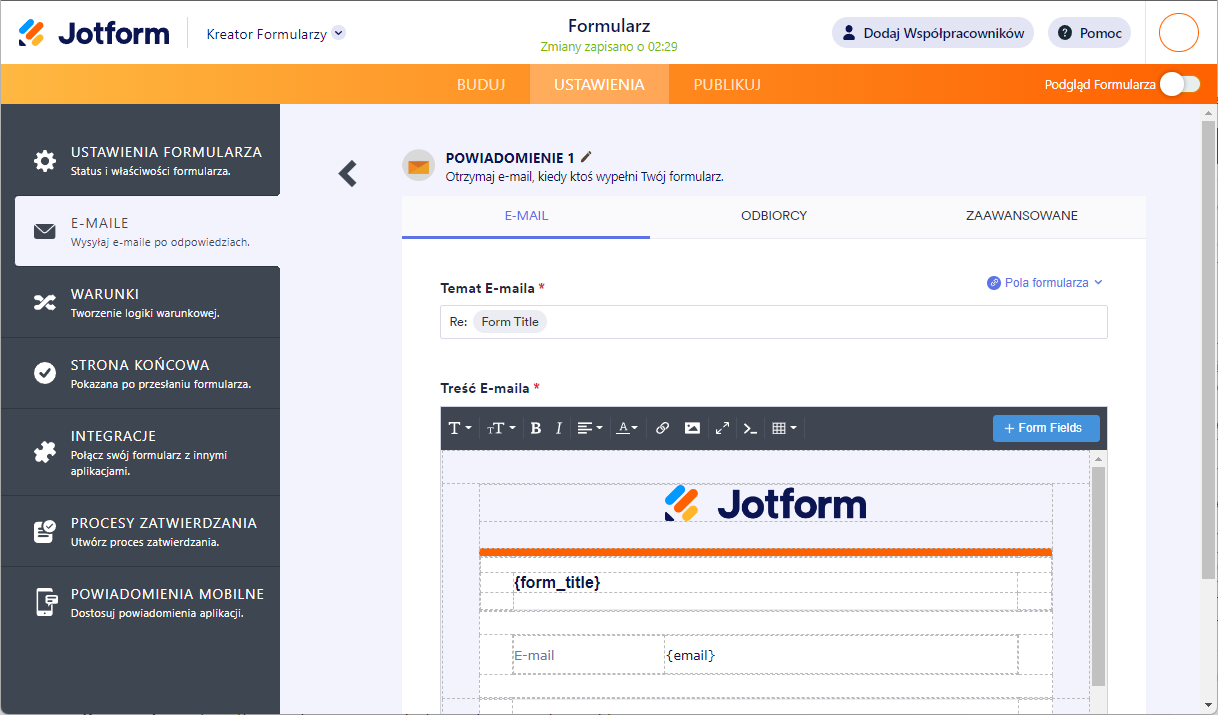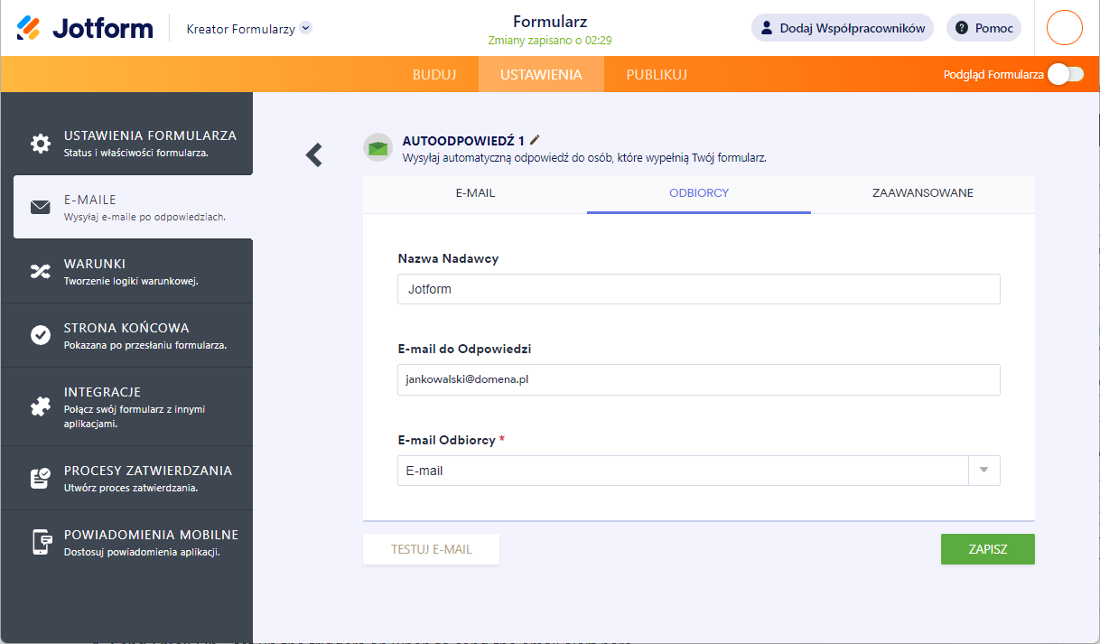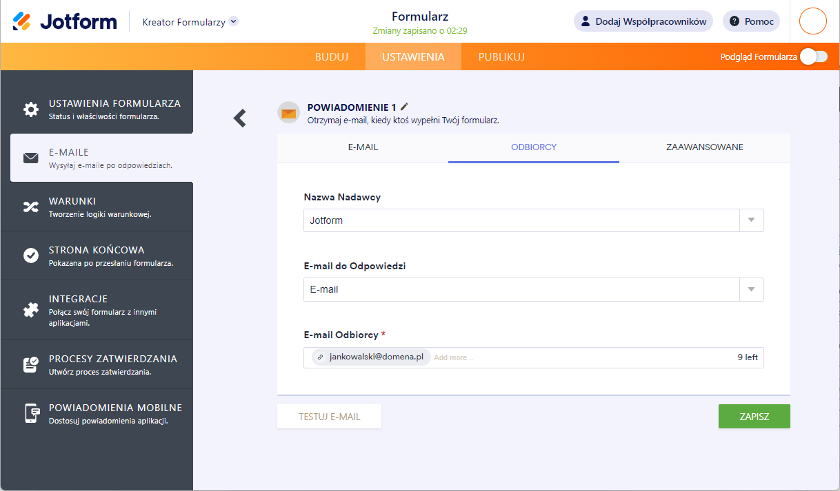 - E-mail Odbiorcy – adres, na który po wypełnieniu formularza przez użytkownika wysyłane będą wiadomości. Domyślnie jest to adres powiązany z Twoim kontem Jotform.