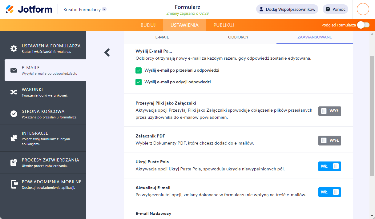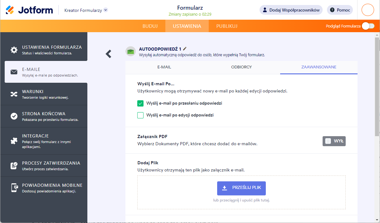 - Załącznik PDF – włącz tę opcję, jeśli chcesz otrzymywać kopię PDF odpowiedzi jako załącznik.