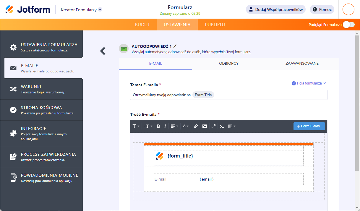 - E-mail Odbiorcy – domyślnie przypisany do pierwszego elementu E-mail dodanego do Twojego formularza. Autoodpowiedzi będą wysyłane na adres wprowadzony do tego pola.