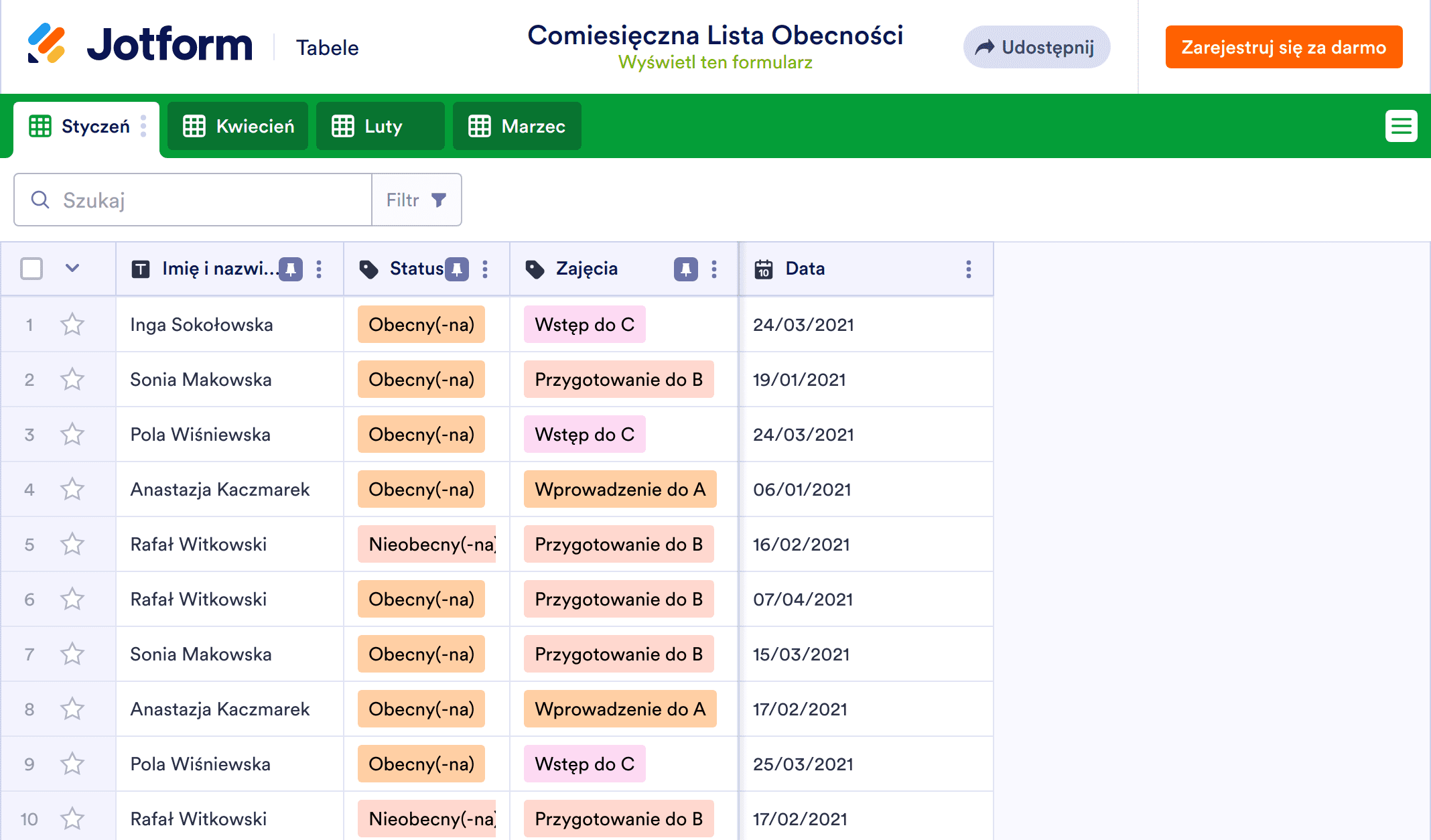 Niezależnie od tego, czy potrzebujesz śledzić obecność uczniów, pracowników, czy wolontariuszy, możesz zarządzać obecnością w lepszy sposób przy pomocy darmowego arkusza obecności od Jotform! By rozpocząć, dostosuj szablon do potrzeb Twojej organizacji i wprowadź dane z dowolnego urządzenia. Masz również możliwość pobrania danych w formacie CSV, PDF lub Excel, by z łatwością udostępnić je współpracownikom.