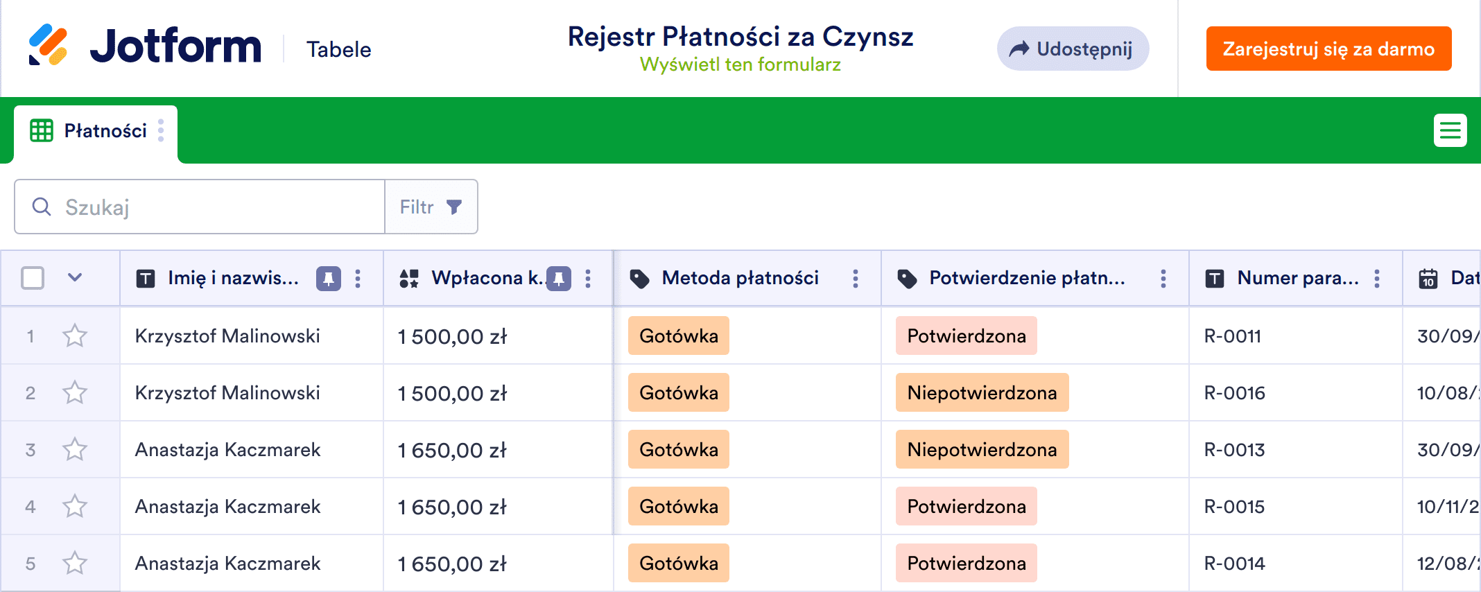 Rejestr płatności za czynsz to arkusz śledzący wpłaty najemców. Niezależnie od tego, czy jesteś wynajmującym, menedżerem czy właścicielem nieruchomości, możesz zarządzać informacjami o płatnościach w profesjonalny sposób przy pomocy bazy danych online Jotform. Wprowadź dane ręcznie, zaimportuj plik CSV lub Excel bądź skorzystaj z formularza online, by pobierać płatności online i automatycznie wprowadzać dane do tabeli!