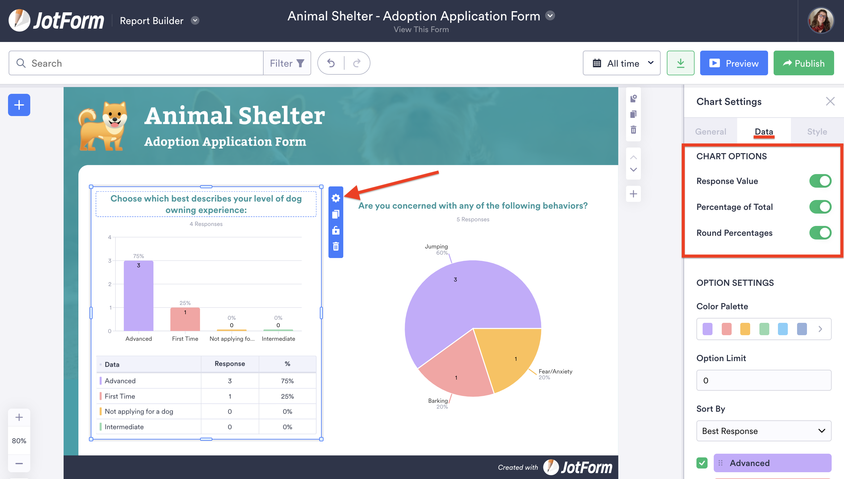Jotform Report Builder can also help you further clarify data by illustrating how responses to online form questions are distributed, using percentages and whole numbers.