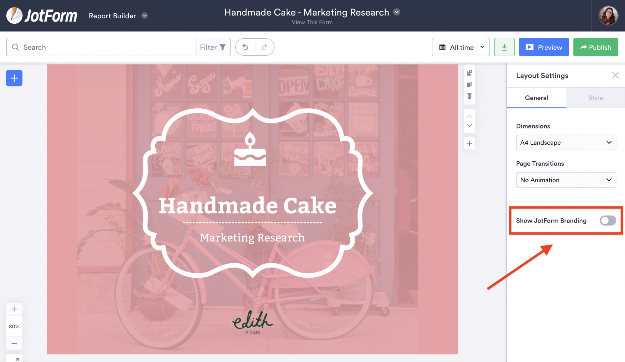 Once you’ve uploaded your business logo, you can resize and reposition it on your report. If you have one of Jotform’s paid plans, you can remove the Jotform branding that automatically appears at the bottom of your report.