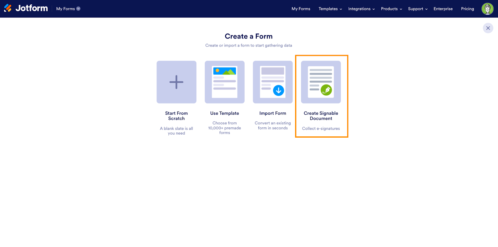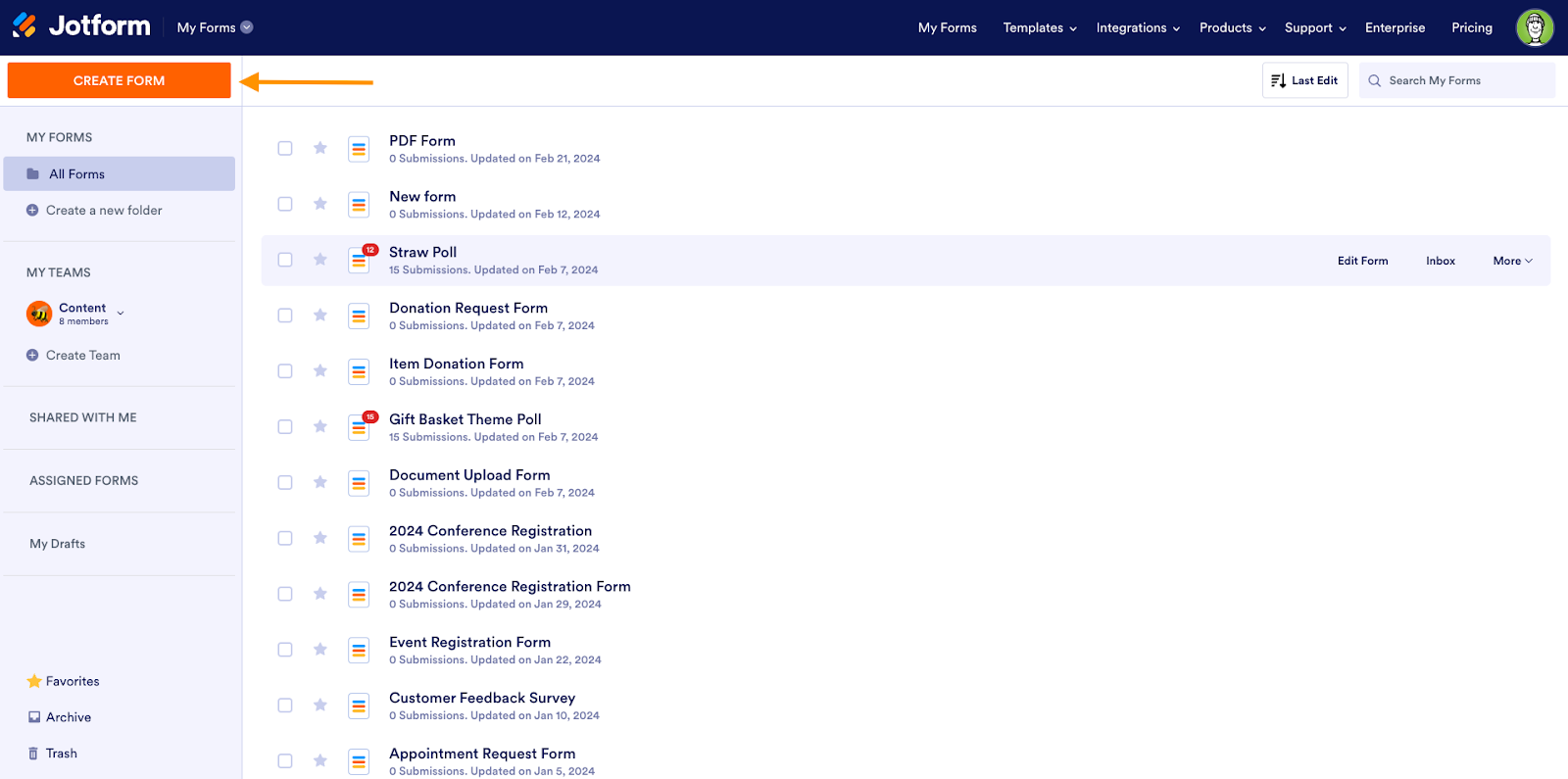 - Navigate to your My Workspace page in your Jotform account and click the orange +Create button.