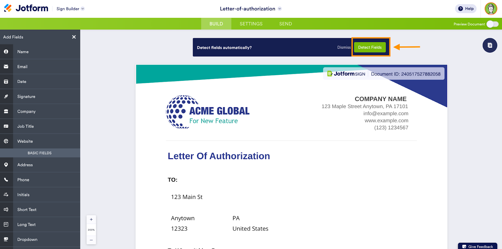- Finally, click the Detect Fields button above the document to automatically scan the document for signature fields. You can also drag and drop elements from the left panel to add fields for signatures, full names, addresses, and more to the PDF.