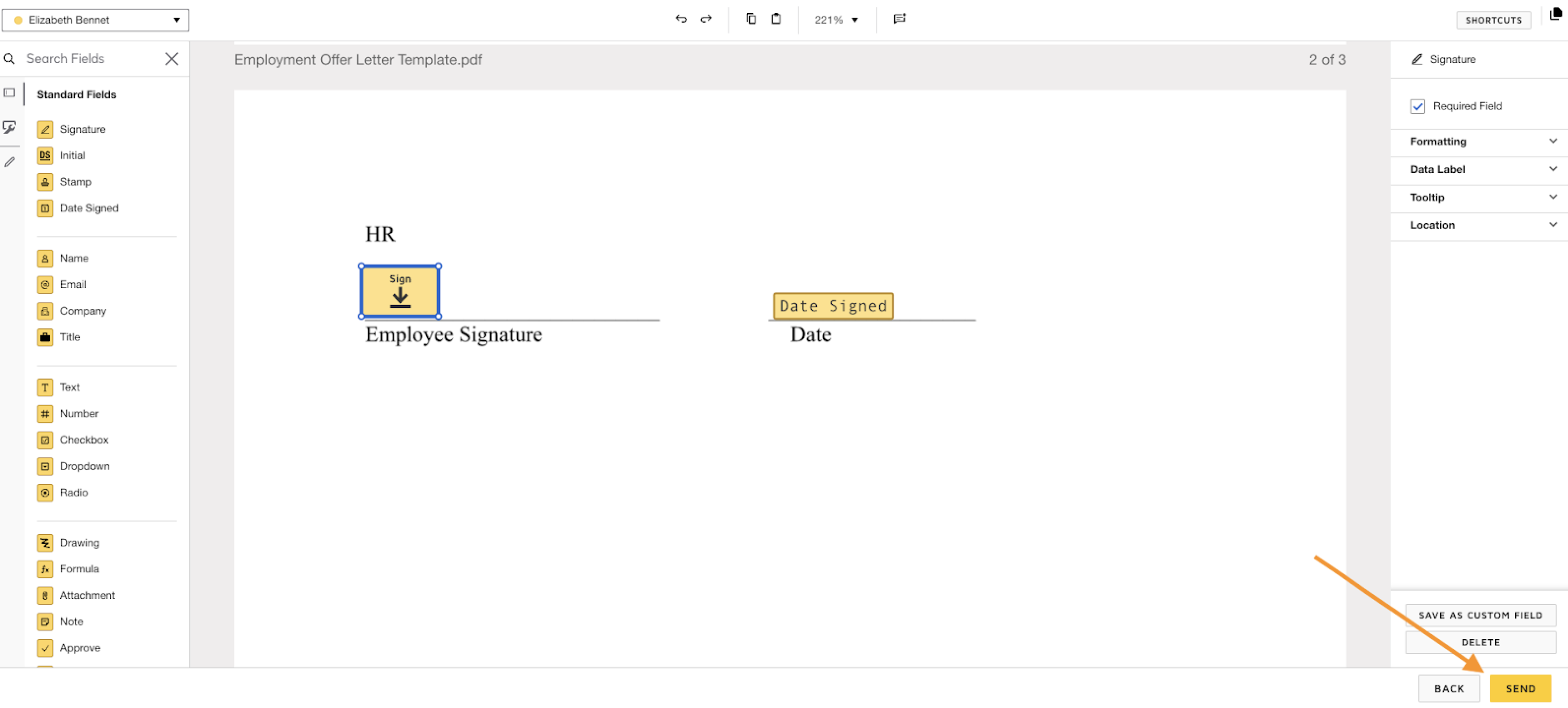- From the left panel, drag and drop fields into the document for the signer to complete — such as name, date, address, initials, and signature.