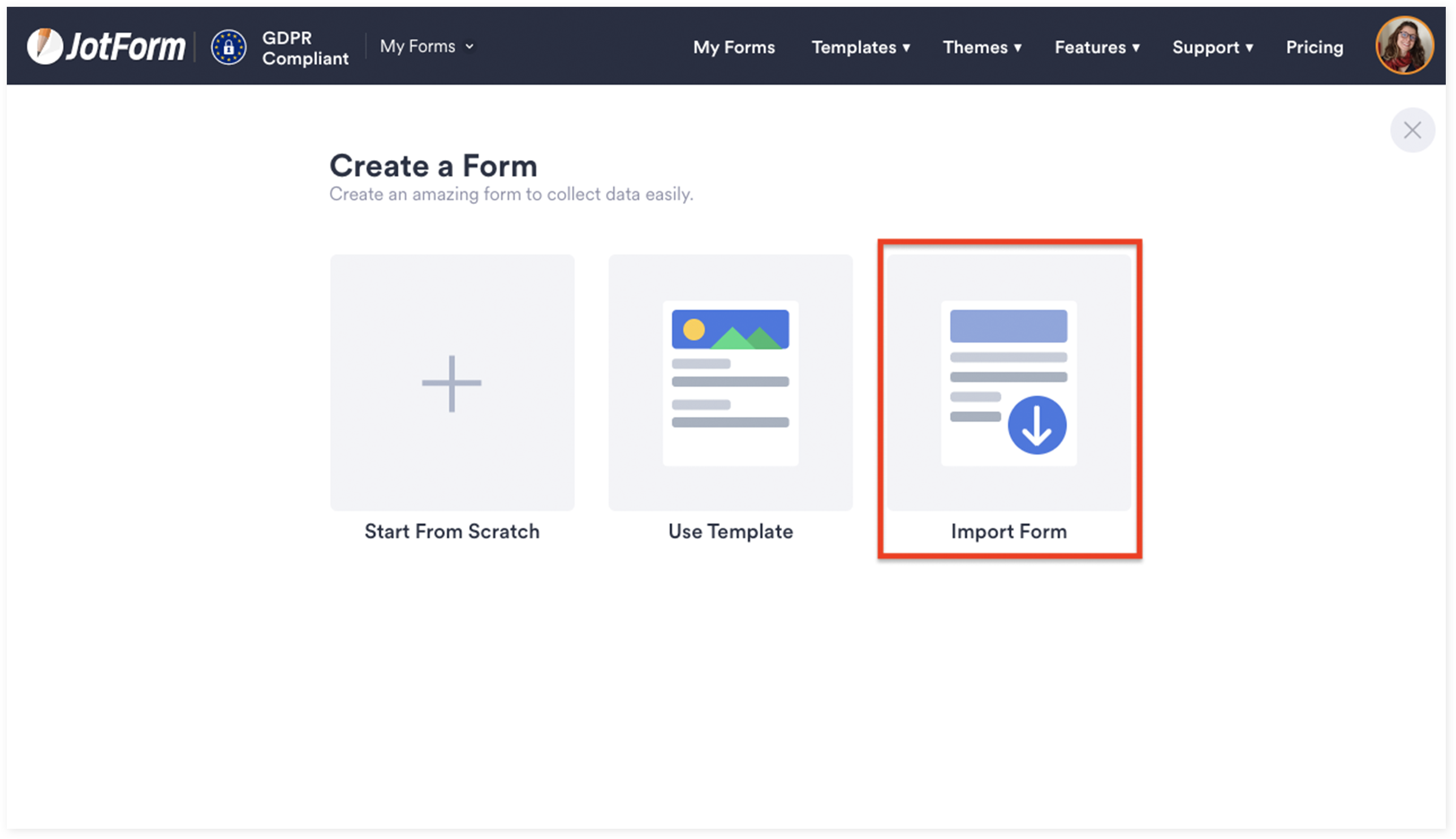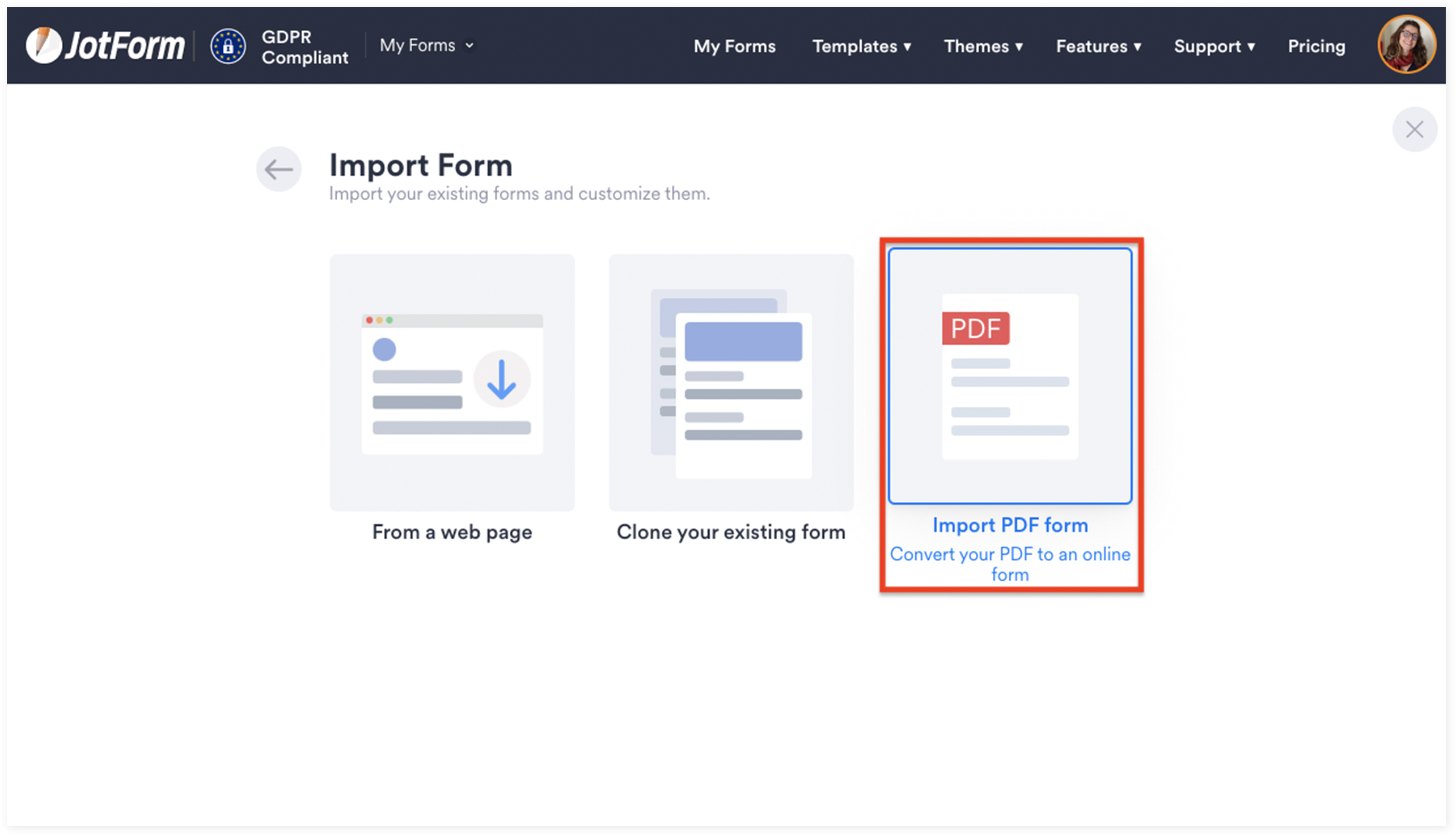 2. Select the Import Form option to upload a PDF form and create an online version of it in JotForm.