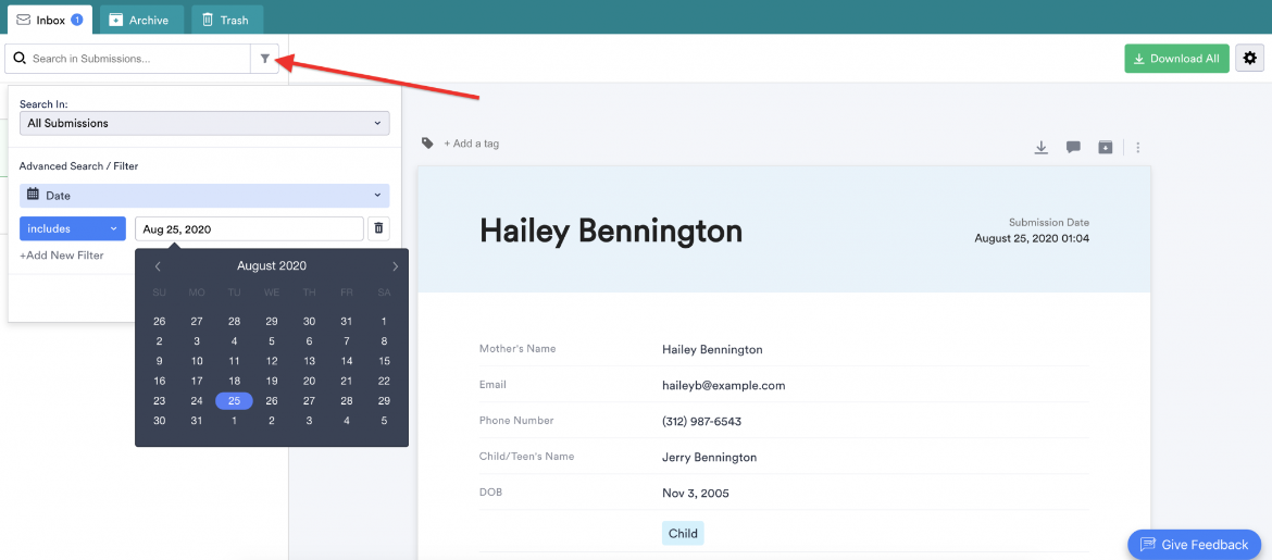 Jotform Inbox even allows you to filter through form responses and find information that meets certain parameters. You could, for instance, search for responses that were submitted on a certain day or locate responses that included a specific answer to a question.