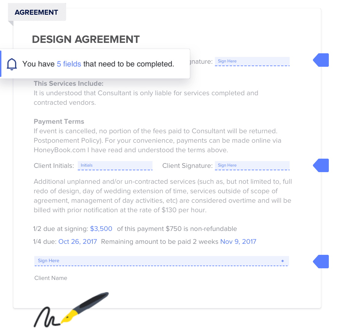 Os modelos para contratos permitem que você assine documentos de forma rápida e eficiente. Essa plataforma completa também o permite receber pagamentos e agendar reuniões. O HoneyBook também facilita a automatização de determinadas tarefas usando o sistema.
