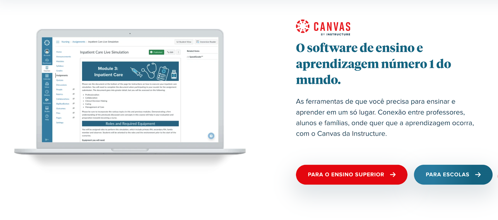 O Canvas, da Instructure, assim como o Blackboard, oferece aos administradores amplos recursos para a criação de experiências de aprendizado mais aprofundadas — como planos de aula e grades curriculares. Também semelhante ao Blackboard, o Canvas é popular entre instituições de ensino superior e permite que educadores integrem seus próprios aplicativos e ferramentas para personalizar a sala de aula digital ideal para eles e seus alunos.