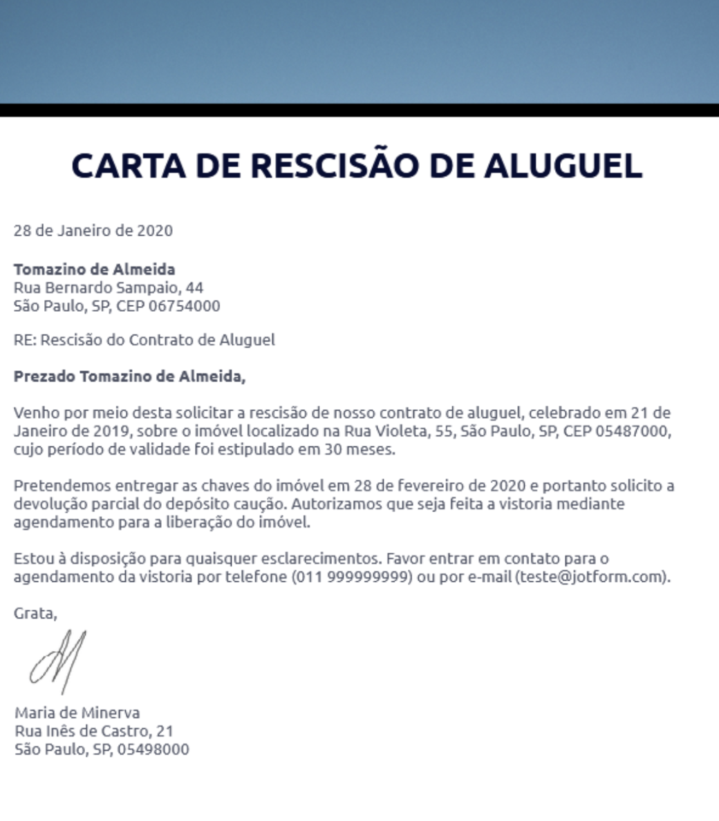 Pode parecer contraintuitivo, mas facilitar o envio de informações sobre a rescisão do aluguel por parte do inquilino pode ser algo vantajoso para o proprietário. Quanto mais cedo você descobrir os planos de um inquilino de deixar a propriedade, mais cedo poderá começar a procurar um novo inquilino para ocupar a unidade. Usar um formulário da web para ajudar seu inquilino a criar uma carta de rescisão do contrato de aluguel é uma maneira eficaz de documentar formalmente o processo de desocupação da propriedade, o que, por sua vez, ajuda o gerente a começar a busca por um novo ocupante.