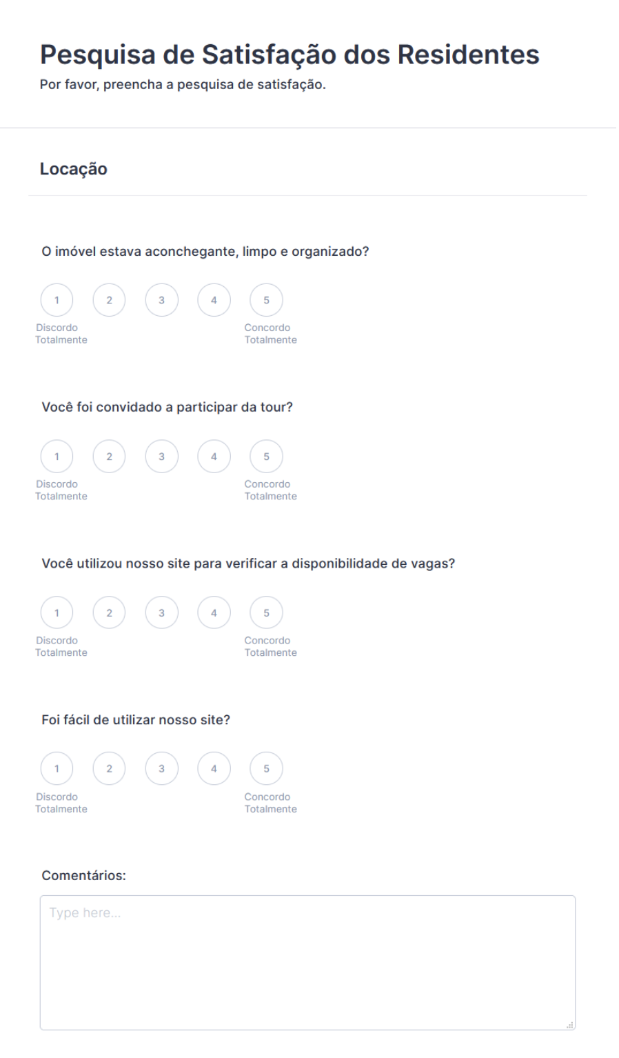 Não deixe que o único feedback recebido de seus inquilinos seja aquele coletado quando algo quebra. Envie periodicamente aos seus inquilinos uma pesquisa para que estes possam fornecer informações sobre seu grau de satisfação com suas instalações, como avaliam a capacidade de resposta da sua equipe de manutenção e o quão úteis consideram as comodidades oferecidas.