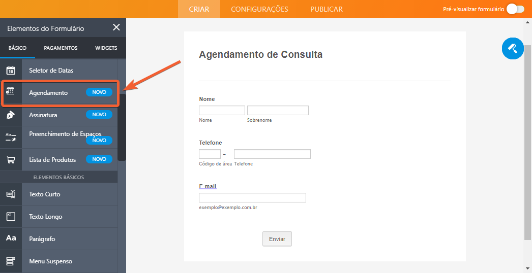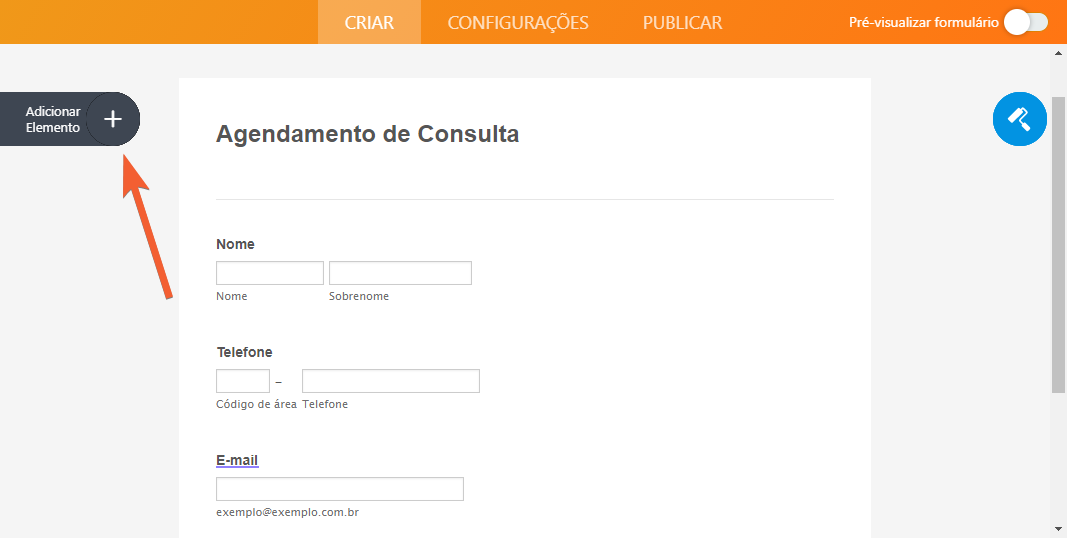 Para adicionar um novo campo Agendamento a um formulário, clique no ícone Adicionar Elemento no Criador de Formulários.
