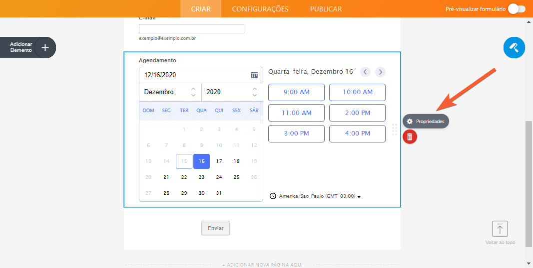 Uma vez que tenha adicionado um campo Agendamento ao seu formulário, você pode configurar um processo para o agendamento de reuniões clicando no ícone Propriedades.