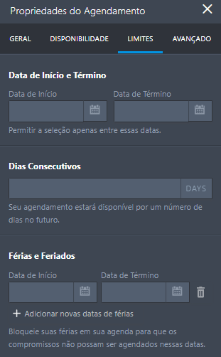 O novo campo Agendamento evita que as pessoas marquem horários muito distantes no futuro, permitindo-o indicar o início e fim do seu calendário. Esta opção (disponível na guia Limites do menu Propriedades) também o permite bloquear dias nos quais você não estará no escritório ou dias de férias.