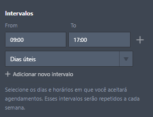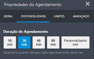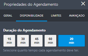 Na guia Disponibilidade do menu Propriedades, você pode alocar períodos de tempo em determinados dias para agendamentos e reservar o restante para dar aulas, participar de reuniões semanais, entre outras atividades regularmente agendadas, sem se preocupar com a possibilidade de alguém agendar um horário neste mesmo período.