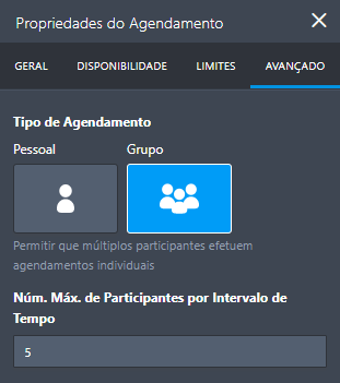 Esta opção – localizada na guia Avançado do menu Propriedades – também pode ser particularmente útil caso múltiplos clientes queiram agendar atendimento em um mesmo horário. Limitar o número de pessoas atendidas ao mesmo tempo reduz problemas quanto à capacidade, além de evitar a sobrecarga de seus funcionários.