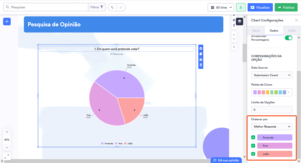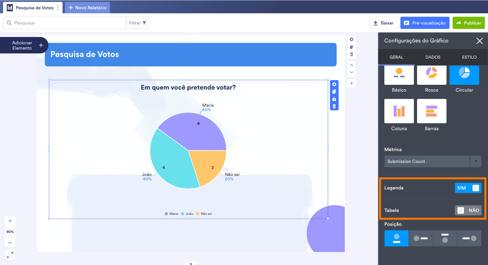 Além de escolher os tipos de gráficos ou diagramas exibidos em seu relatório, você também pode indicar quantas pessoas responderam a uma pergunta, mostrar quantas pessoas selecionaram uma resposta específica e ilustrar como determinadas respostas a uma pergunta representam uma determinada porcentagem do total de respostas.