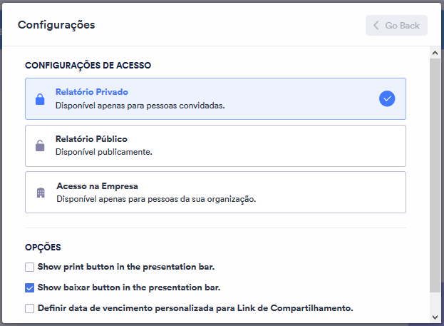 Após criar um relatório atrativo e que satisfaça todas as suas expectativas, você pode baixá-lo em formato PDF, imprimi-lo, compartilhá-lo por e-mail com uma mensagem personalizada, distribuí-lo usando um link exclusivo ou incorporá-lo ao seu site.
