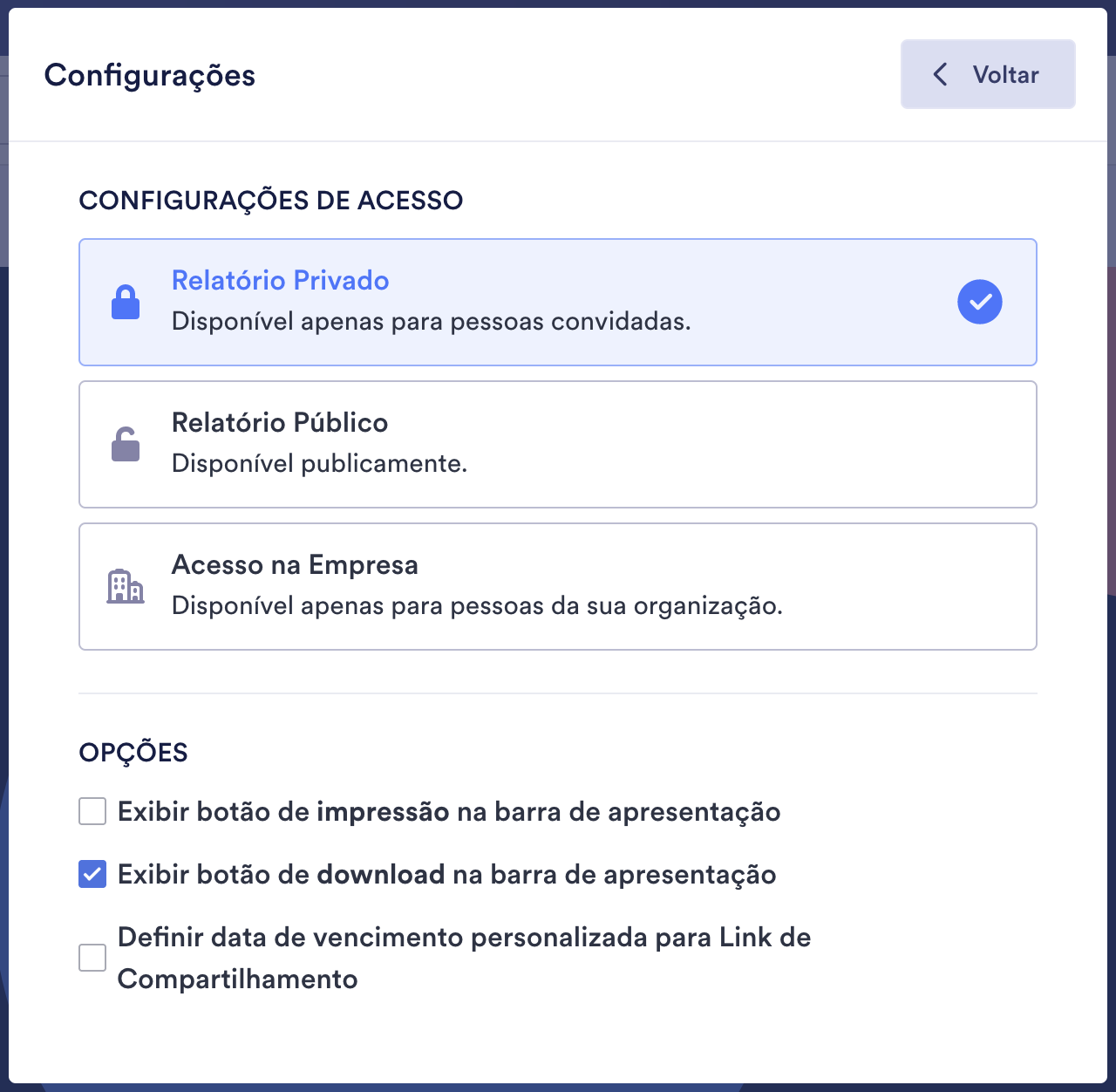 Existem também proteções que o permitem controlar quem possui acesso ao seu relatório, o que estes podem fazer com o mesmo e por quanto tempo podem acessá-lo, para que você possa coletar dados de forma segura.