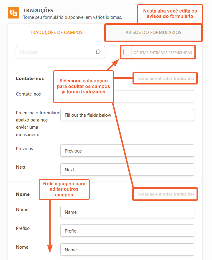 - A janela de tradução se abrirá, exibindo as traduções para cada um dos campos. Para identificar campos não traduzidos, clique na caixa Ocultar Entradas Preenchidas; agora você verá apenas os campos que ainda precisam ser traduzidos. Ao adicionar novas traduções, Jotform salvará suas alterações automaticamente. Caso precise traduzir os avisos em seu formulário, clique na aba Avisos do Formulário.