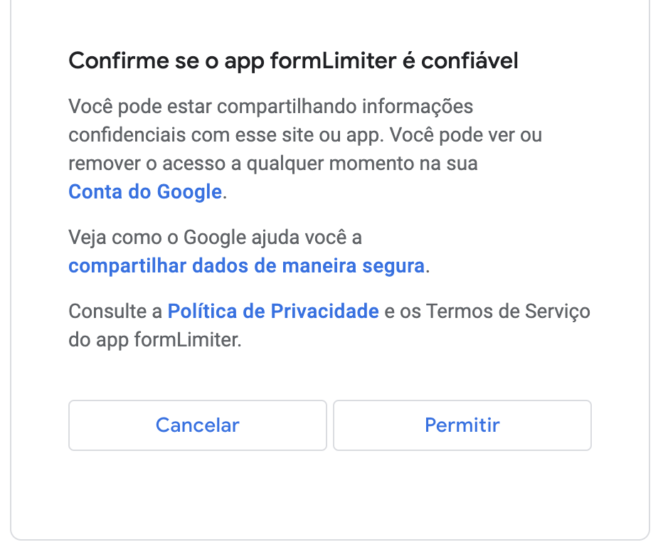 - Você receberá uma notificação perguntando se confia no formLimiter. Clique em Permitir.
