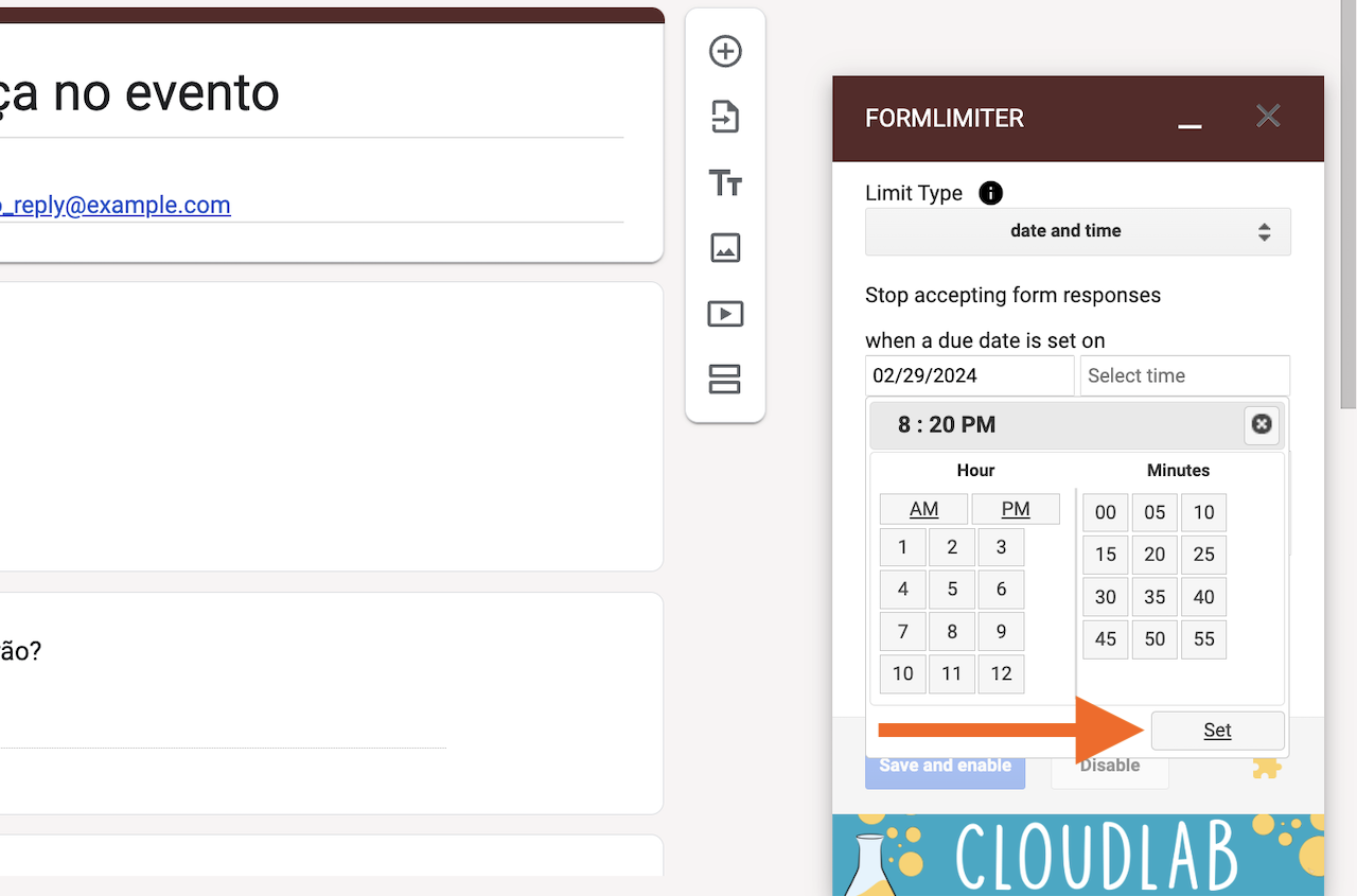 - Escolha a data e a hora em que você deseja que o formulário seja fechado. Clique em Set (Definir).