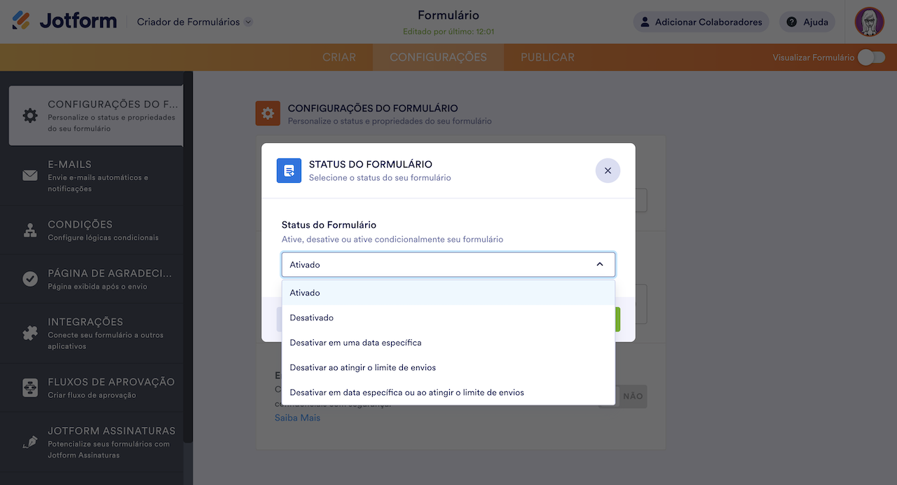 - O menu suspenso Status do Formulário lhe dará várias opções, incluindo “Desativar em uma data específica” e “Desativar ao atingir o limite de envios”.