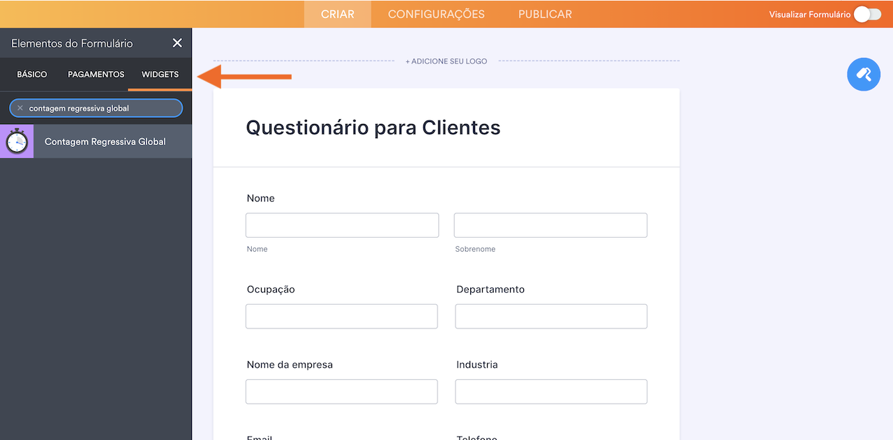 - Selecione o widget Contagem Regressiva Global da Jotform.