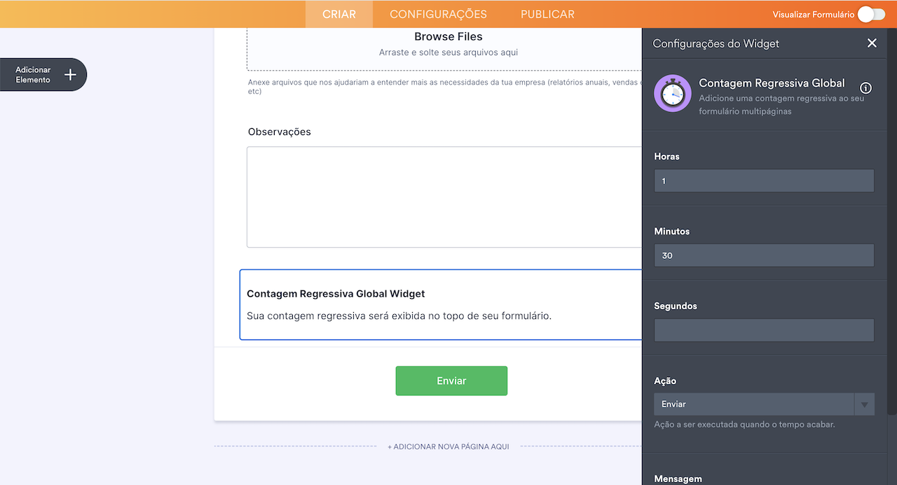 Jotform também oferece outras opções relacionadas ao tempo, como adicionar um cronômetro ao seu formulário. O cronômetro limitará o tempo que os respondentes têm para preencher o formulário. É ideal para testes ou pesquisas cronometrados, quando se deseja incentivar os respondentes a dar rapidamente suas reações iniciais. O cronômetro é exibido em todas as páginas do formulário, para que os respondentes possam ficar atentos à rapidez com que estão progredindo no formulário.