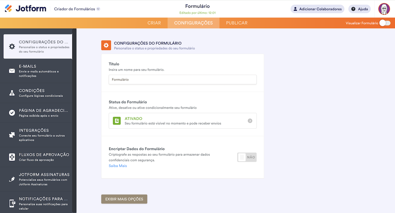 - Clique em Configurações e selecione Configurações do Formulário.