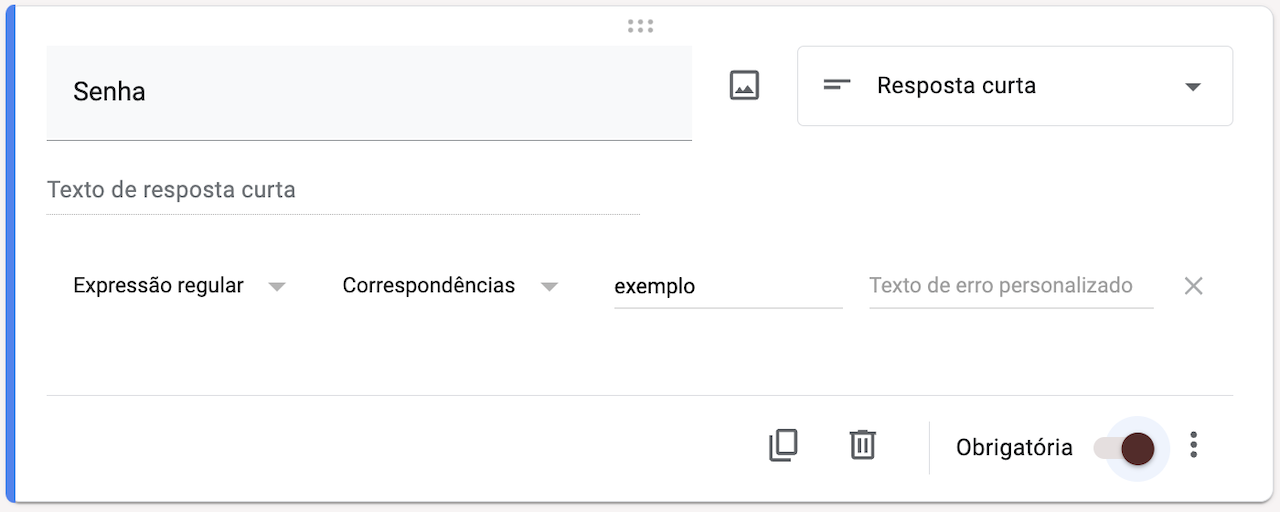 - Comece adicionando uma pergunta ao início do seu formulário. Certifique-se de que esta seja uma pergunta de Resposta curta. O texto da pergunta deve solicitar que o respondente insira a senha, como, por exemplo, “Digite a senha para preencher o formulário”.