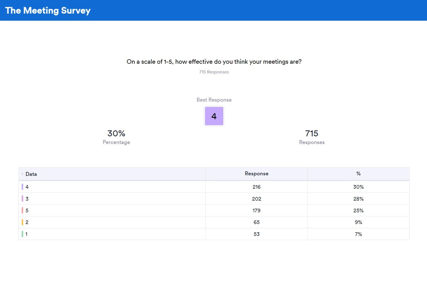 Os idealizadores da pesquisa apresentaram a última pergunta, a qual questionava sobre a eficácia da reunião, no formato de resumo em tabela. O resumo em tabela coloca a resposta selecionada em uma posição de destaque. Este também lista todas as respostas em ordem de frequência.