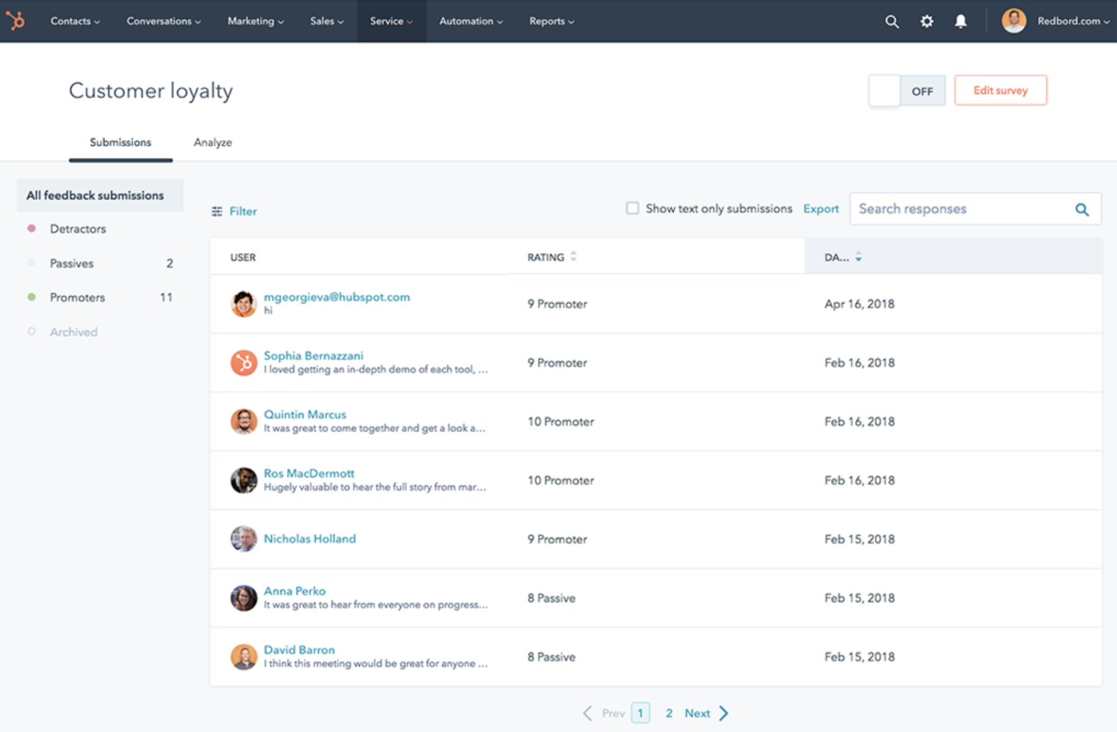 O HubSpot oferece uma opção de software para a coleta de feedback do cliente, o que é muito útil para empresas que já utilizam sua conhecida plataforma de software para marketing de entrada e vendas.