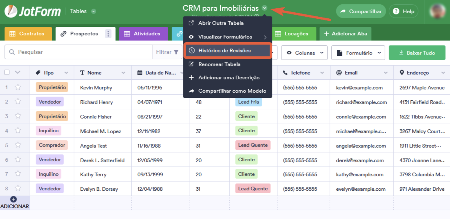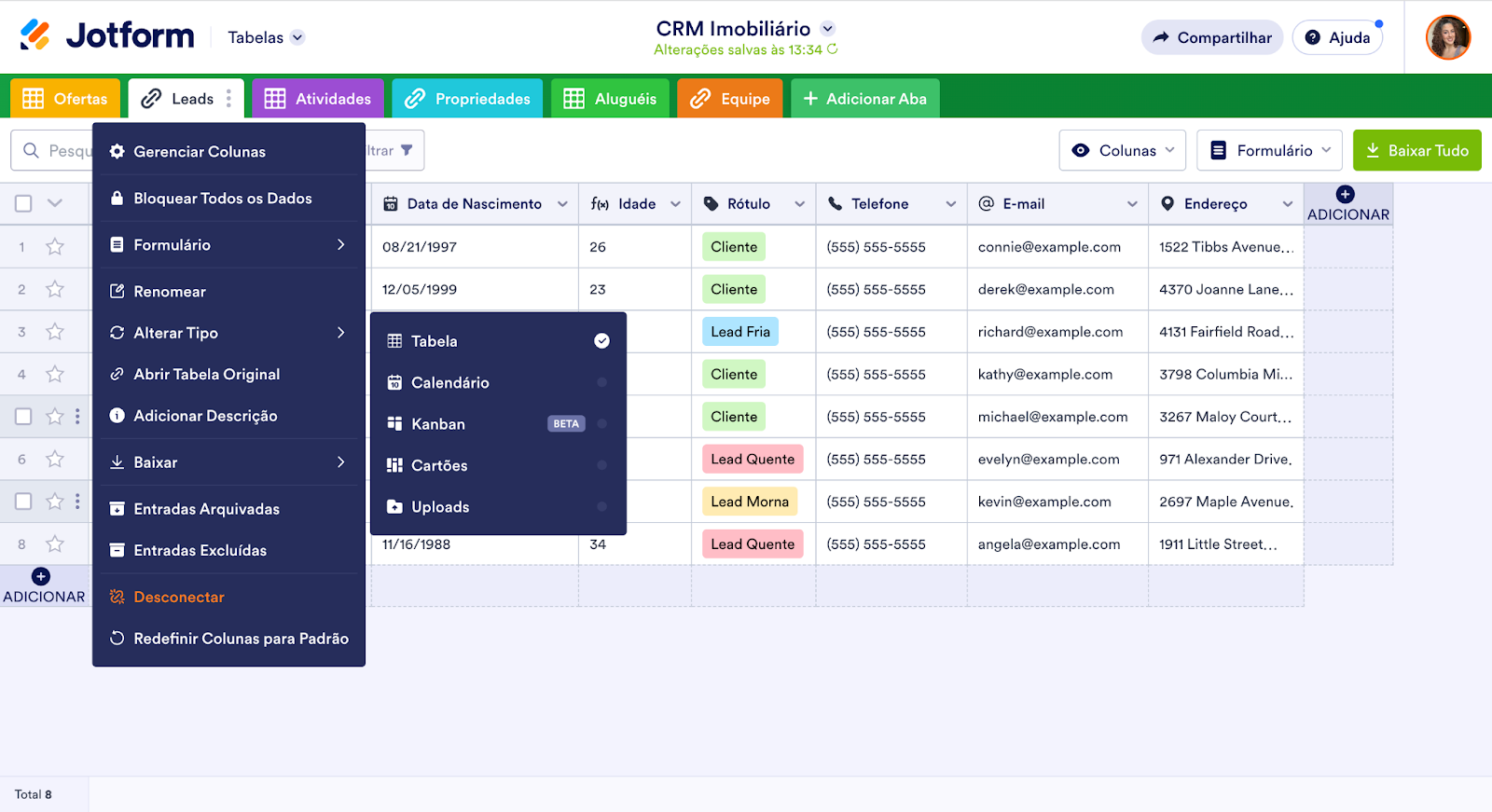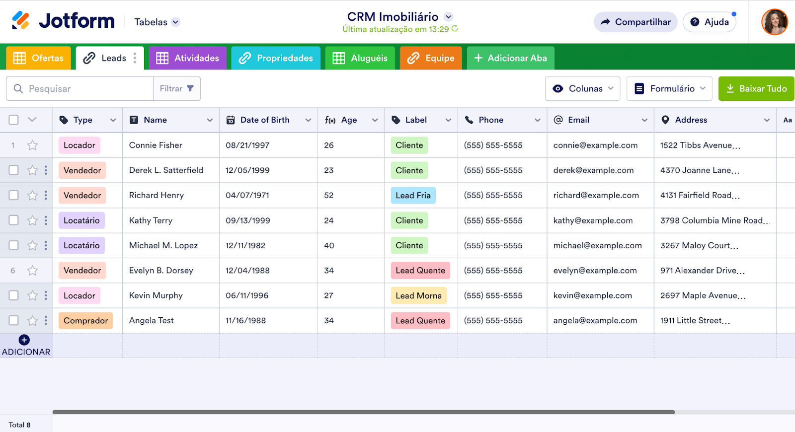 Conectando estes formulários online a uma única área de trabalho no Jotform Tabelas, você pode ficar de olho em seus inquilinos, acompanhar leads de potenciais clientes e conferir o que seus colegas estão fazendo para atribuí-los tarefas e mover contas por seu pipeline sem grandes esforços.