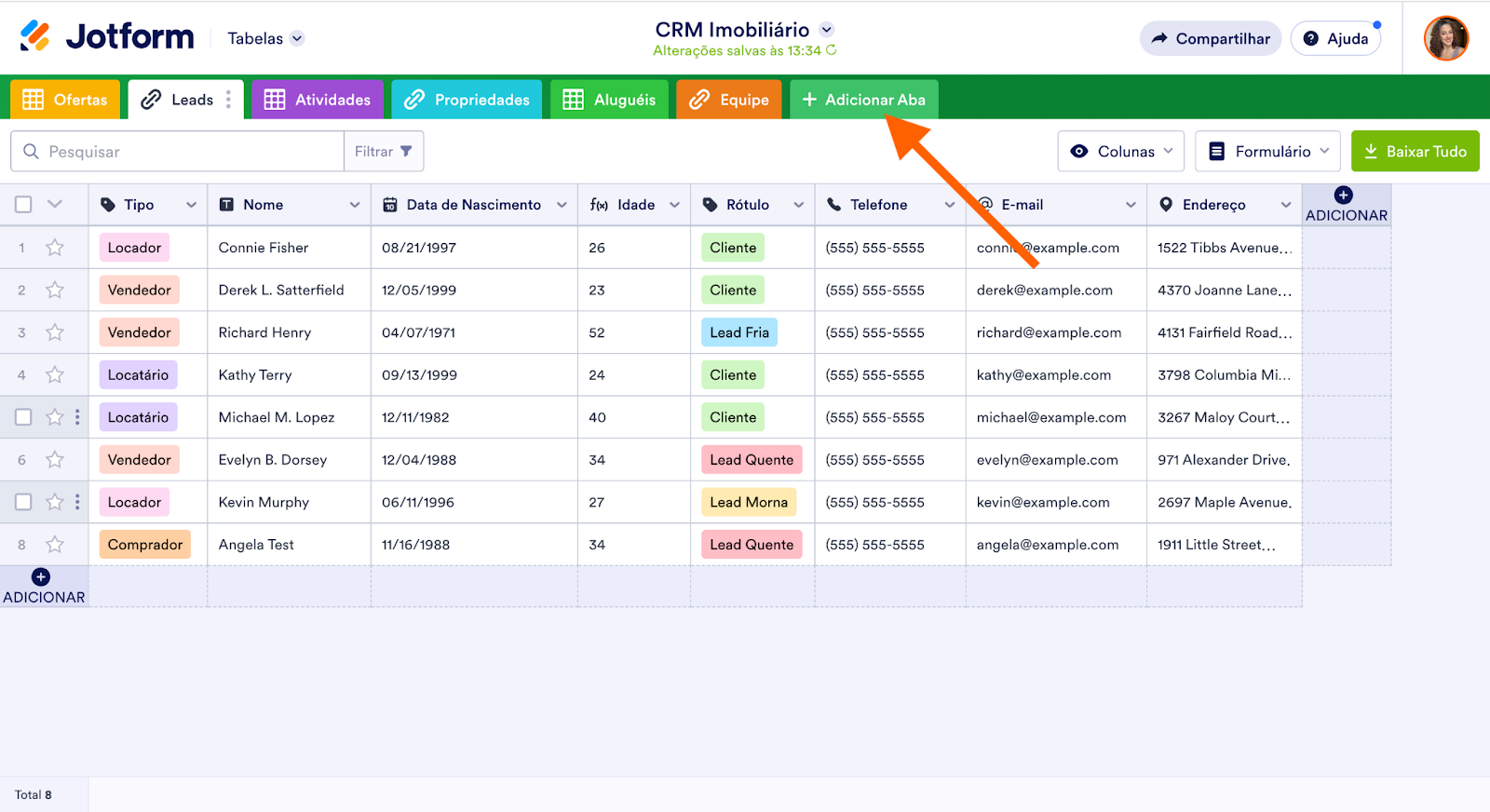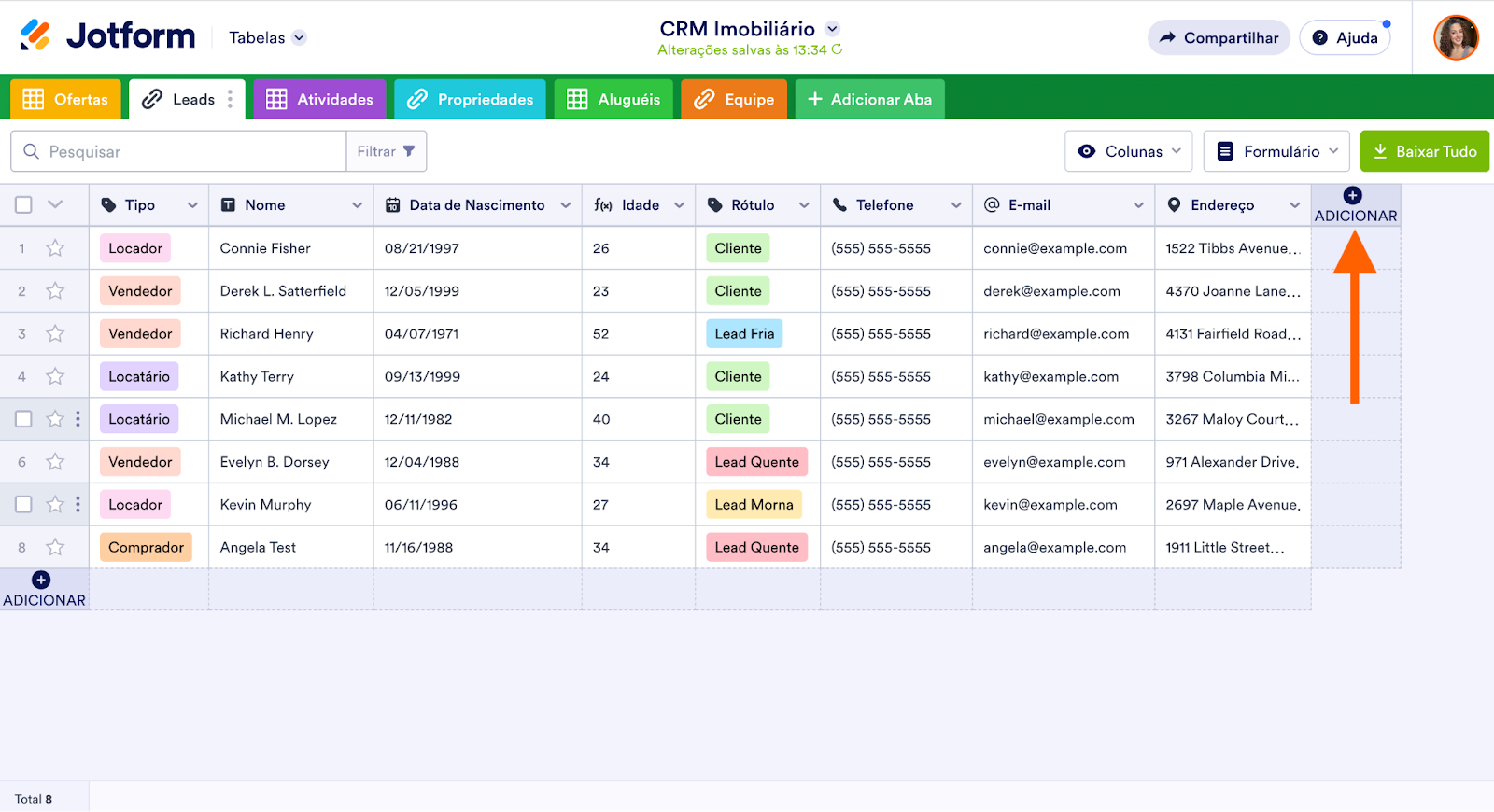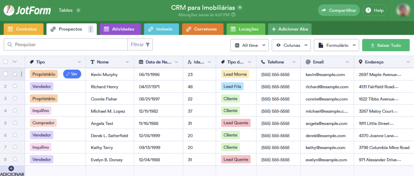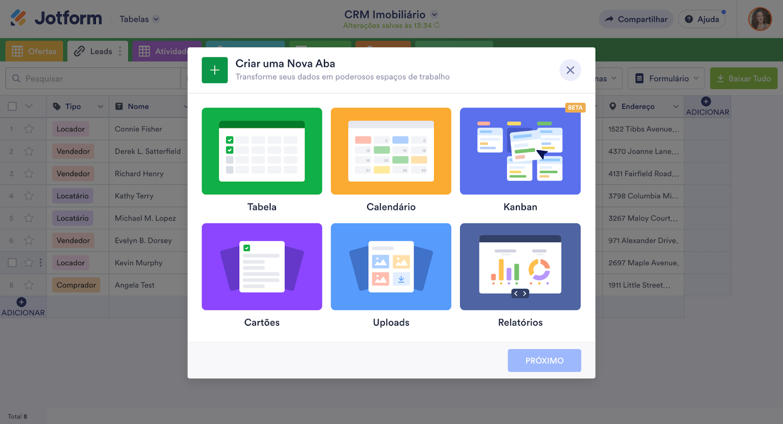Conectando estes formulários online a uma única área de trabalho no Jotform Tabelas, você pode ficar de olho em seus inquilinos, acompanhar leads de potenciais clientes e conferir o que seus colegas estão fazendo para atribuí-los tarefas e mover contas por seu pipeline sem grandes esforços.