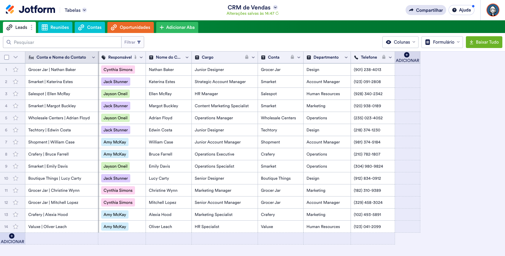 Como é possível conectar múltiplos formulários online para a geração de leads a uma única área de trabalho, Jotform Tabelas pode ajudá-lo a criar um sistema de CRM completo, garantindo que seus usuários sempre saibam quais negócios estão sendo fechados, quais produtos estão em estoque e quais iniciativas de marketing estão sendo desenvolvidas.