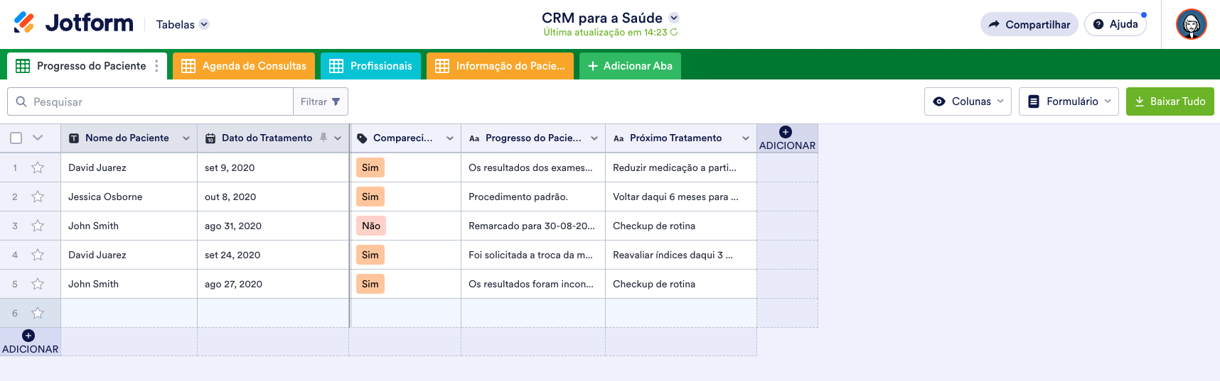 Você pode então usá-los para criar um CRM personalizável automaticamente no Jotform Tabelas, permitindo-o atribuir colegas a pacientes específicos e adicionar observações internas sempre que necessário. Você também pode criar novas abas para monitorar consultas agendadas para uma data específica, visualizar informações médicas de pacientes específicos antes de vê-los e criar um diretório de funcionários online para seu escritório.