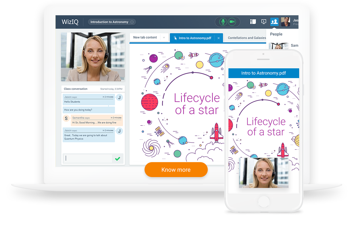 O WizIQ é uma plataforma de software para salas de aula virtuais baseada em nuvem com uma interface fácil de usar que simplifica sua experiência de uso. Esta permite que professores apresentem sessões de aula em sala ao vivo, completas com uma comunicação bidirecional, o que significa que você pode conversar diretamente com seus alunos em tempo real – não importa onde estejam.