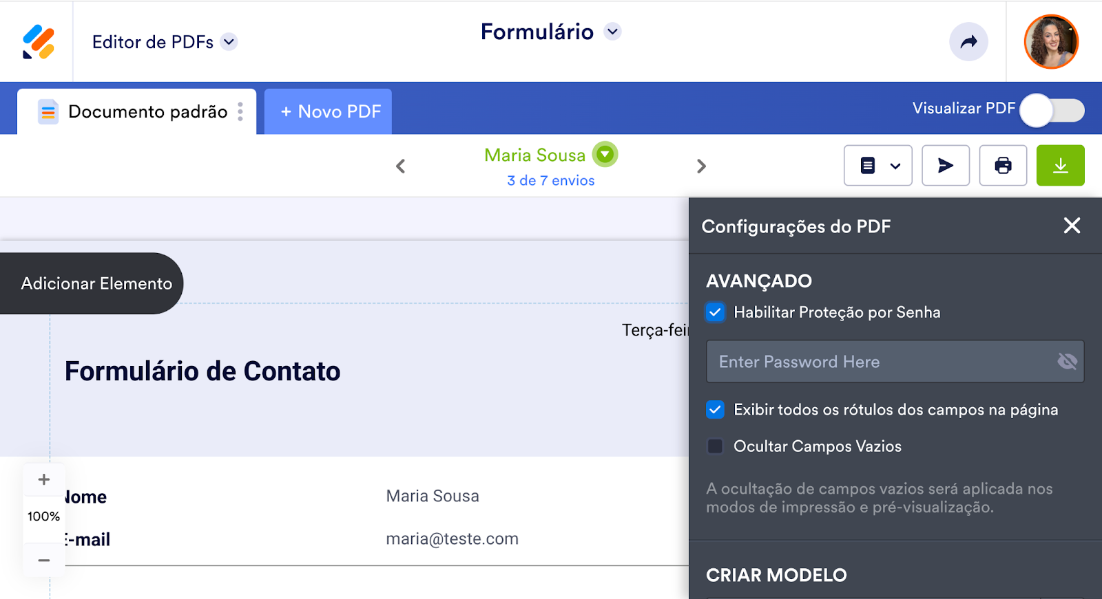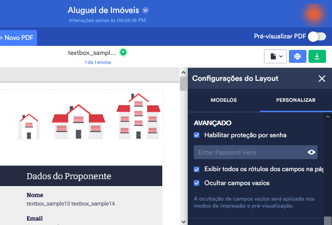 O Editor de PDFs Jotform permite ativar a proteção por senha em qualquer um dos documentos em PDF criados a partir de informações enviadas através de seus formulários. Você pode encontrar esta opção no menu do Editor de PDFs Jotform, podendo personalizar e modificar as configurações de layout do seu documento.