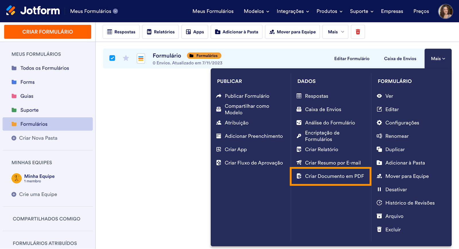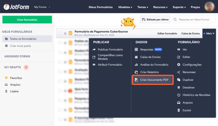 Jotform, por sua vez, facilita a conversão de um formulário online existente em um PDF preenchível. Este processo se dá no painel da sua conta Jotform, onde todos os seus formulários são listados.