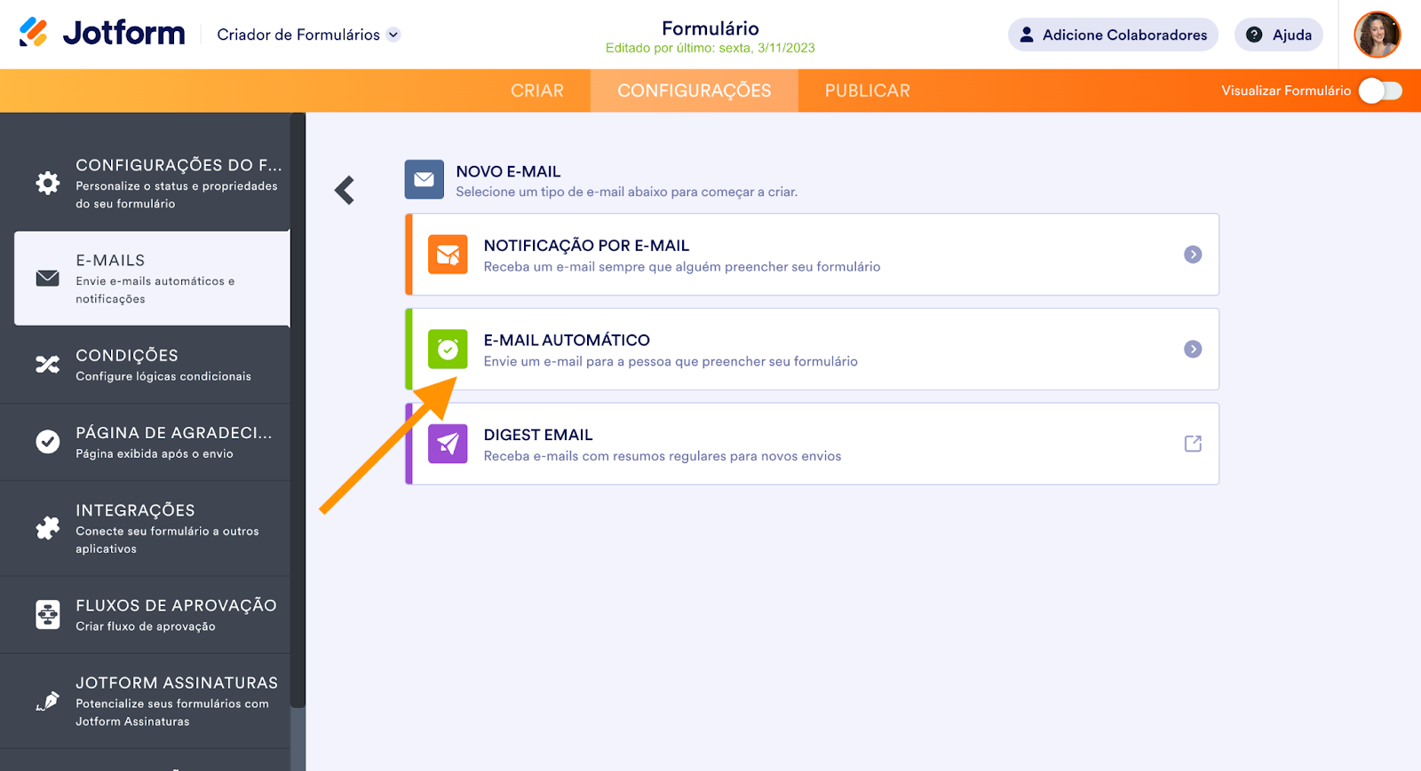 Este recurso pode ser encontrado no Criador de Formulários Jotform e está disponível durante a criação de um PDF preenchível. Você pode habilitar esta opção ao criar um e-mail de resposta automática, que pode ser enviado para todos os respondentes do seu formulário.