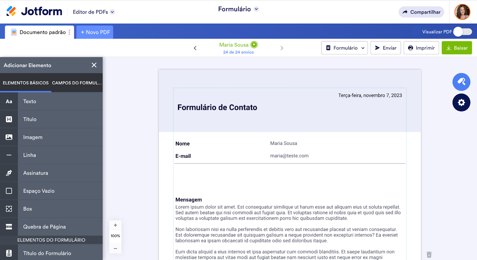 O Editor de PDFs da Jotform permite que todos os usuários Jotform transformem dados submetidos através de seus formulários em PDFs elegantes e profissionais que podem ser facilmente compartilhados, arquivados e reutilizados usando nossos recursos nativos. Como documentos em PDF no Editor de PDFs Jotform estão vinculados a formulários online específicos, quaisquer envios recebidos podem ser automaticamente utilizados para criar múltiplos documentos em PDF.