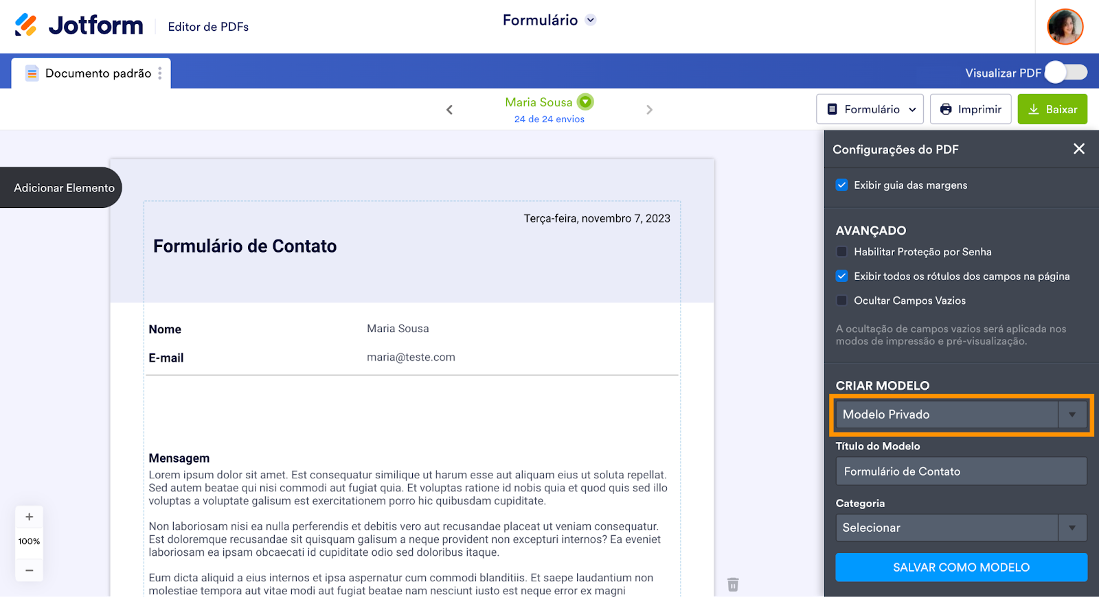 Caso queira que seu modelo sirva apenas para uso próprio, certifique-se de marcá-lo como um “Modelo Privado” antes de salvar o documento. Criar um “Modelo Público” implica no envio de uma cópia da montagem de seu documento (sem suas informações pessoais) para a galeria de modelos do Editor de PDFs Jotform, onde qualquer um poderá encontrá-lo e utilizá-lo.